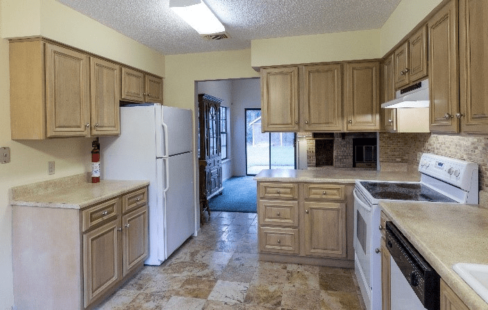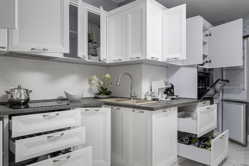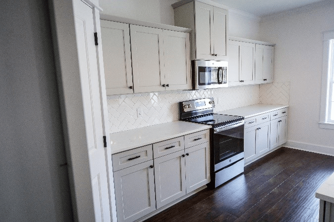 Shaker style cabinets are a very popular form of cabinetry. They have simple, but attractive design that works with any design aesthetic. Shaker style cabinets use recessed doors with 90-degree angles and minimal to no adornments. They typically feature light finishes and simplistic hardware.