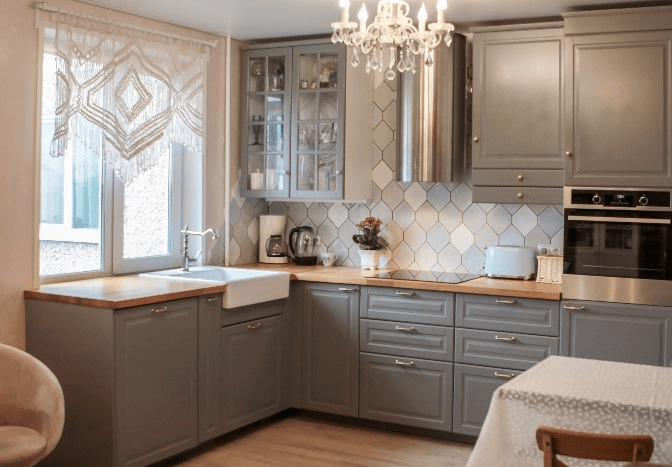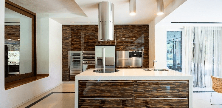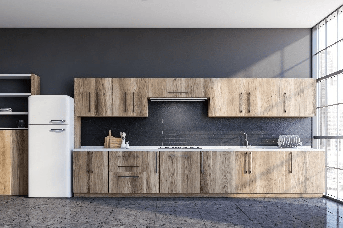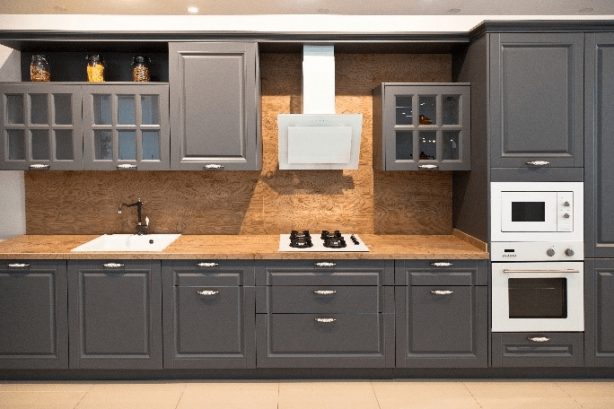 A raised panel cabinet door has a center panel that is just a little higher than the surrounding door frame. This style of cabinet door can be used in both tradition and modern kitchen designs, though they are more popular in traditional/transitional designs. This door style is created by either attaching the panel with adhesive or fitting the panel into grooves in the door frame. They can incorporate arches or 90-degree angles. Sometimes glass or metal inserts are used to add an interesting and unique appearance that work with different design aesthetics. This type of door can also be used in areas created to conceal appliances.