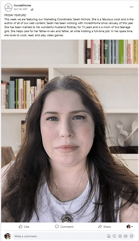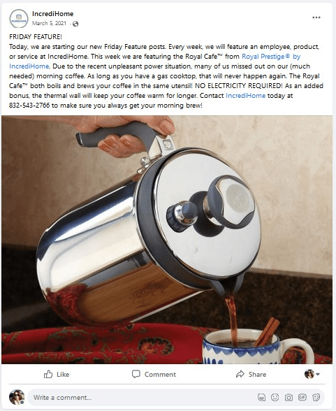 This post was created when I worked for Alpha Marketing for it’s client Alpha Dessert Juice Cafe. For this post I created it from start to finish including directing the photoshoot of the food and model direction, post creation, post content, and hashtagsThis post was created when I worked for Alpha Marketing for it’s client Alpha Dessert Juice Cafe. For this post I created it from start to finish including directing the photoshoot of the food, post creation, post content, and hashtags.The Friday Feature posts for IncrediHome also included posts about employees. As there were only 2 employees of IncrediHome when I worked there, this post was about me.Another Friday Feature post. This one touched on recent power outages in the Houston area.This post was created while working for Hestia Construction & Design. It included photo editing, post content, and hashtags.